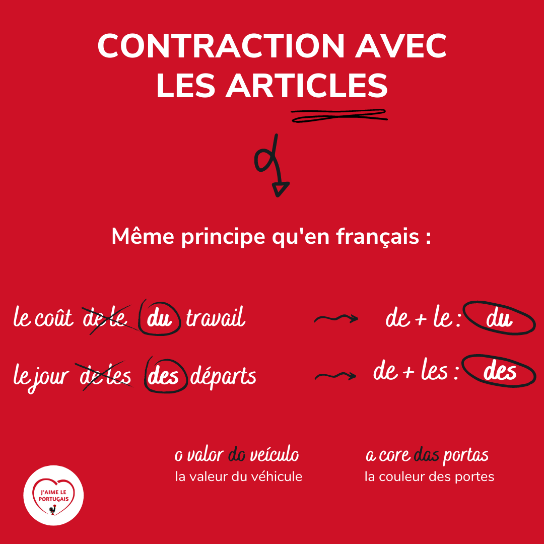 La préposition de se contracte avec les articles définis o (le), a (la), os et as (les) mais aussi avec les articles indéfinis um (un), uma (une), uns (quelques) et umas (quelques).