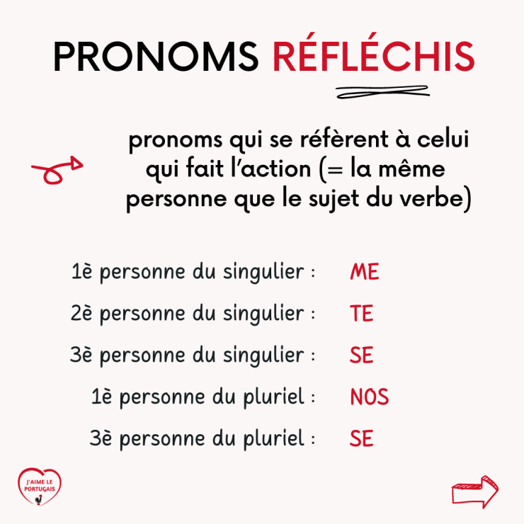 Les verbes pronominaux utilisent les pronoms réfléchis (me, te, se…). Pour conjuguer un verbe pronominal en portugais, vous devez donc connaître quels sont ces pronoms réfléchis en portugais.