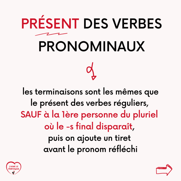 En portugais, pour conjuguer un verbe pronominal au présent, on utilise les mêmes terminaisons que pour la conjugaison des verbes réguliers, SAUF à la 1ère personne du pluriel où le -s final disparaît (avec le pronom nós), puis on ajoute un tiret avant le pronom réfléchi :
